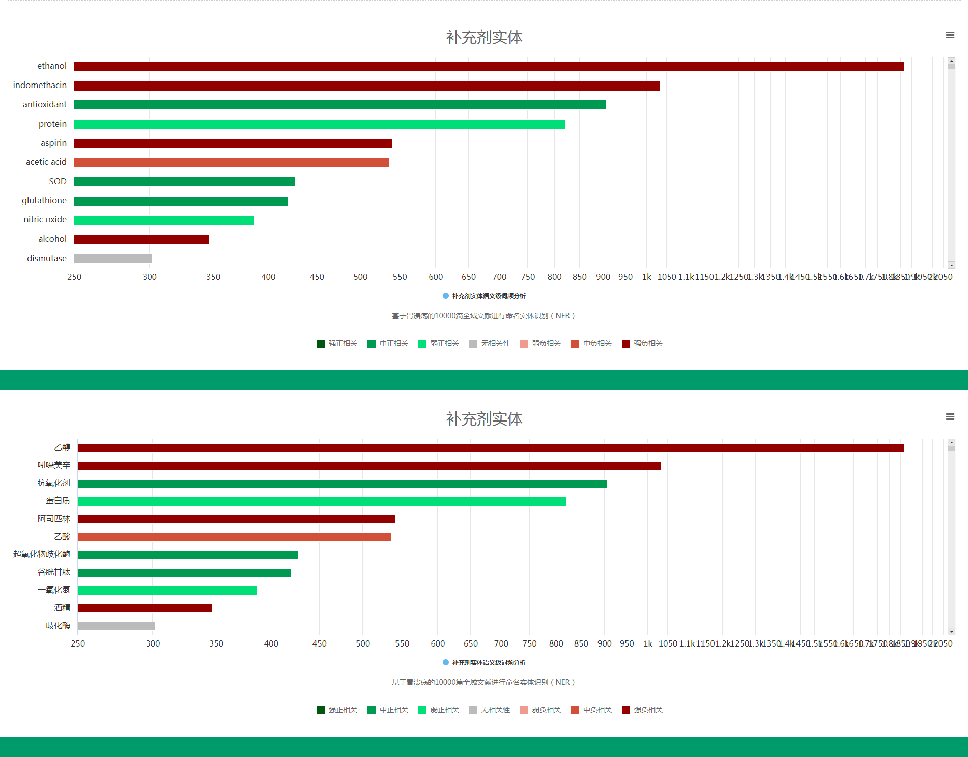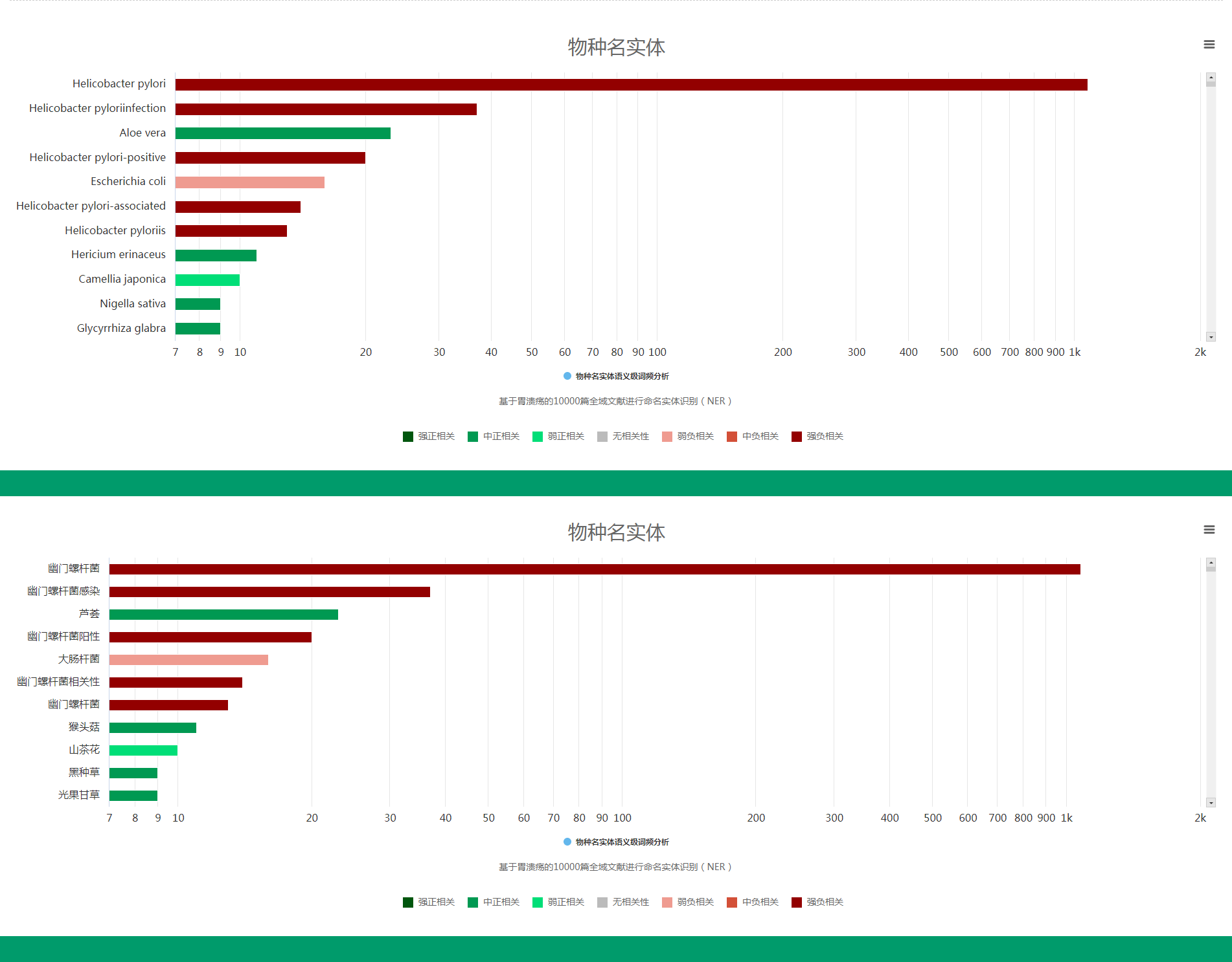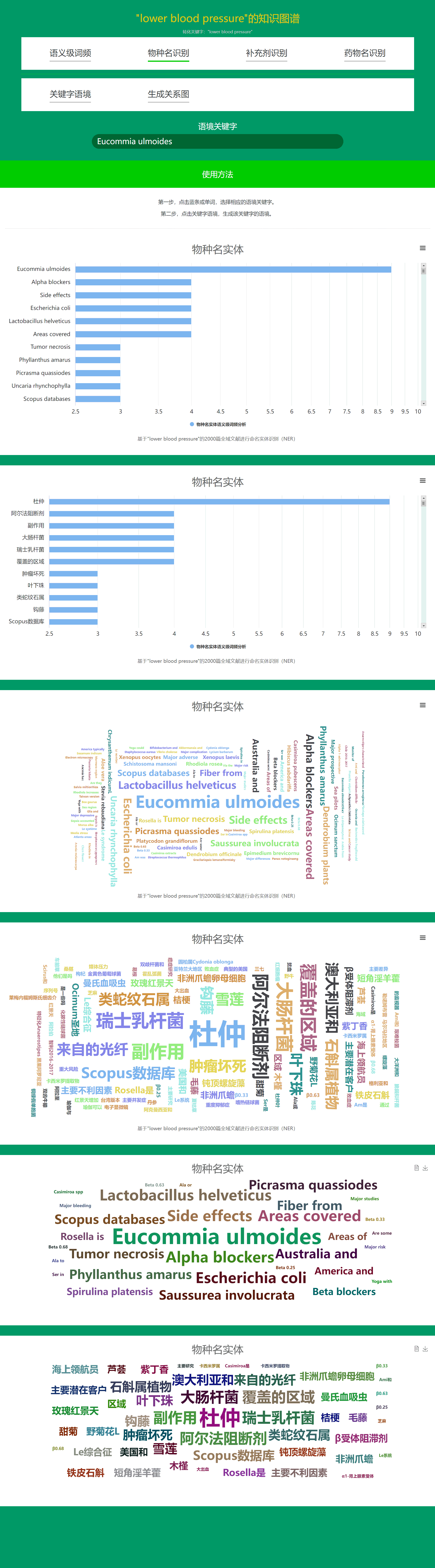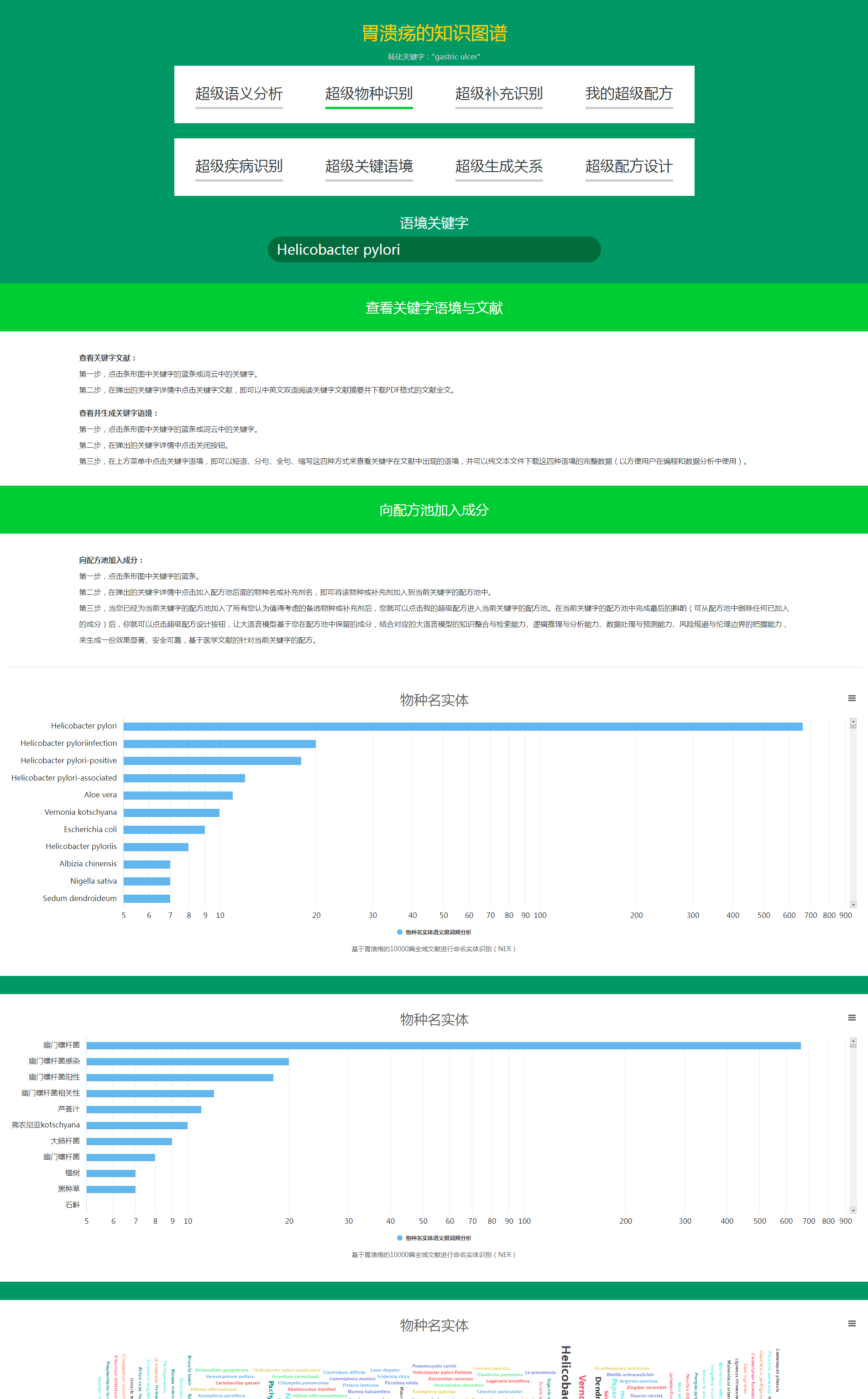 在超级物种识别和超级补充识别中,物种名实体和补充剂实体中会(按语义级词频排序)列出与当前疾病或诉求密切相关的物种和补充剂。这种相关性既包含了正相关(对治疗该疾病或达到该诉求有效),也包含了负相关(对治疗该疾病或达到该诉求不利)。