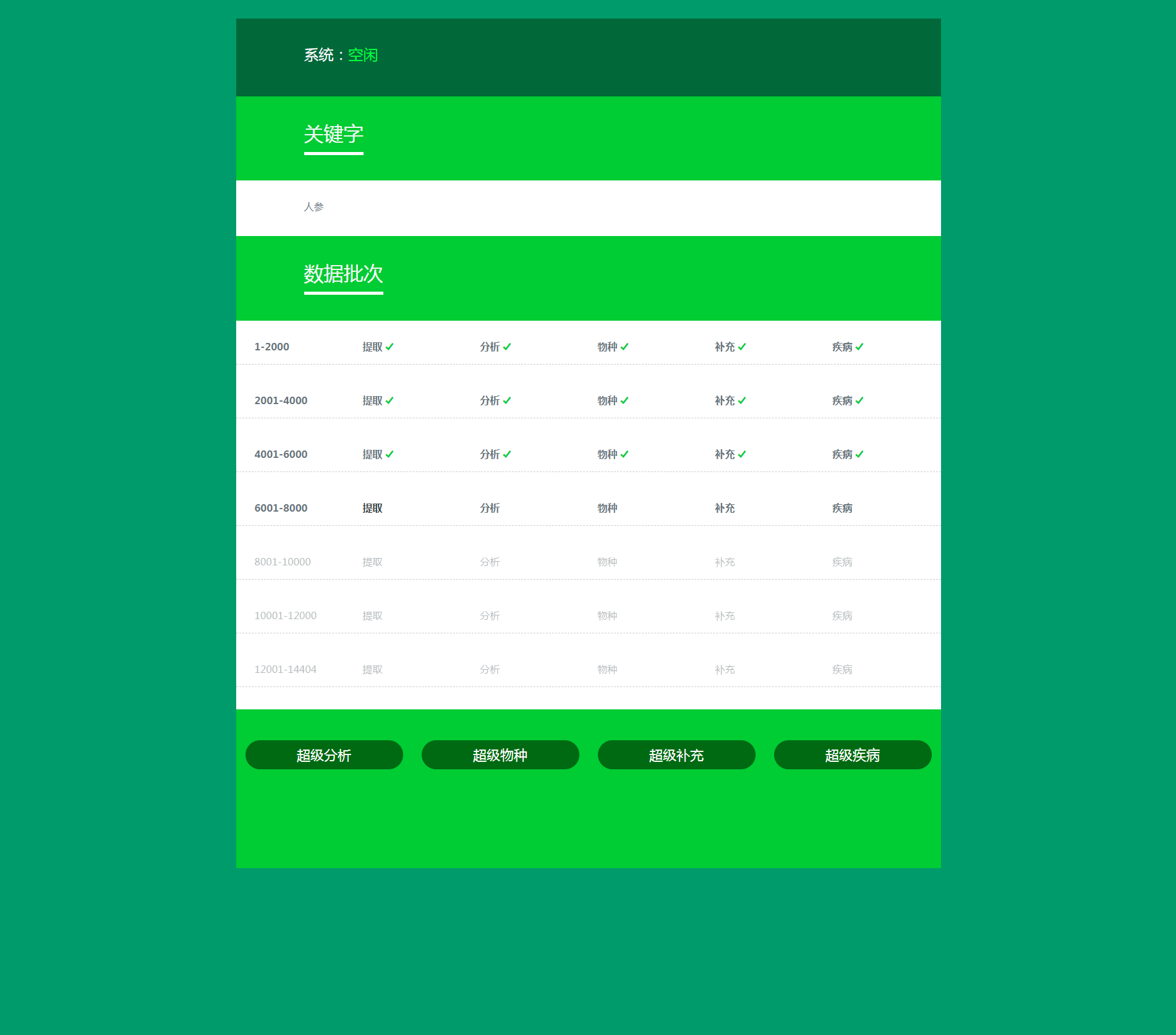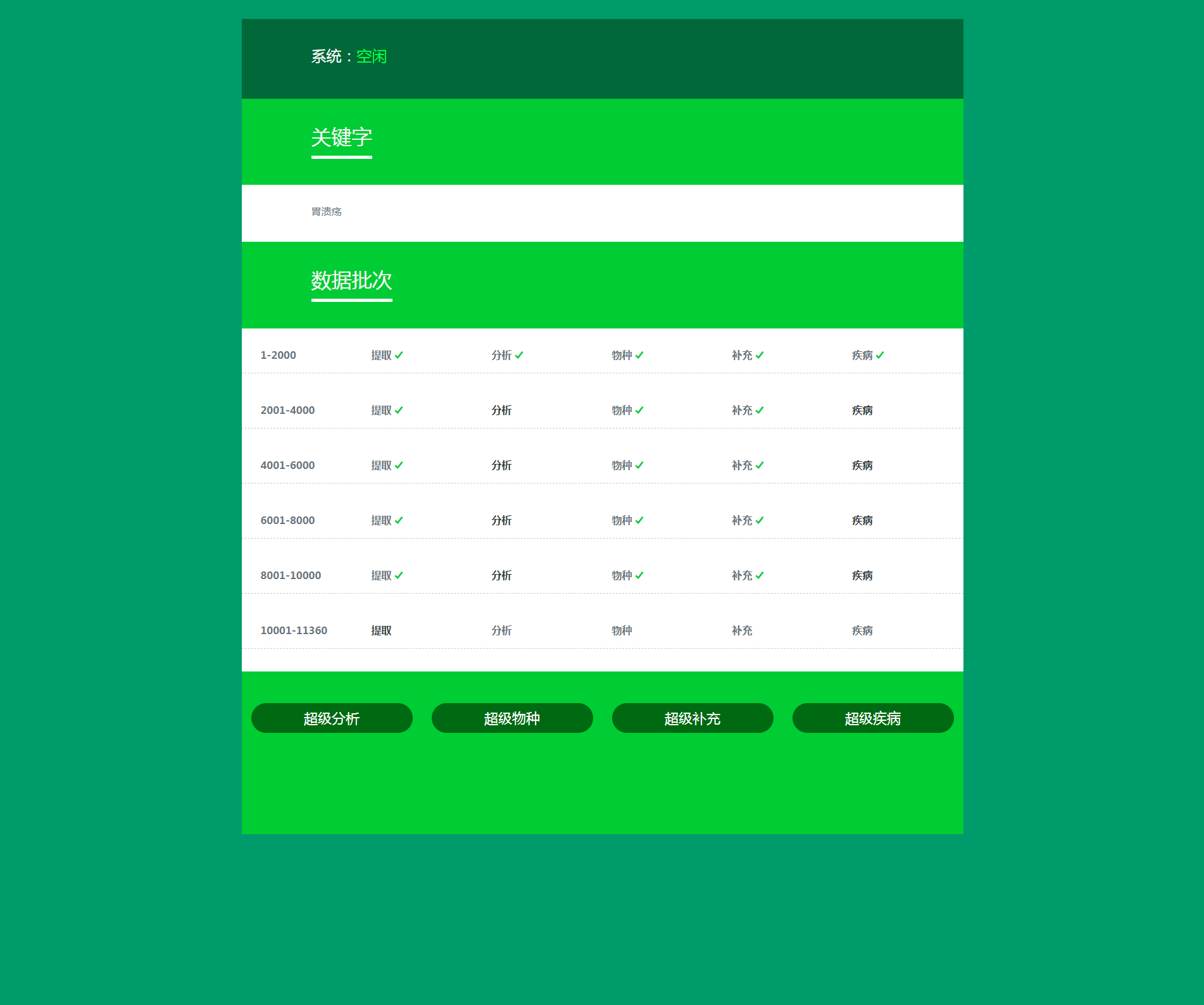 超级数据通过批次检索和获取机制,也使得您不必完成全部数据批次就可以随时基于目前已经完成的数据批次生成超级分析结果、超级物种结果、超级补充结果和超级疾病结果。并且,随着您完成更多的数据批次,您可以看到生成的超级分析结果、超级物种结果、超级补充结果和超级疾病结果也在随之发生变化。当您完成全部数据批次时,您可以生成最终的决定性的超级分析结果、超级物种结果、超级补充结果和超级疾病结果。