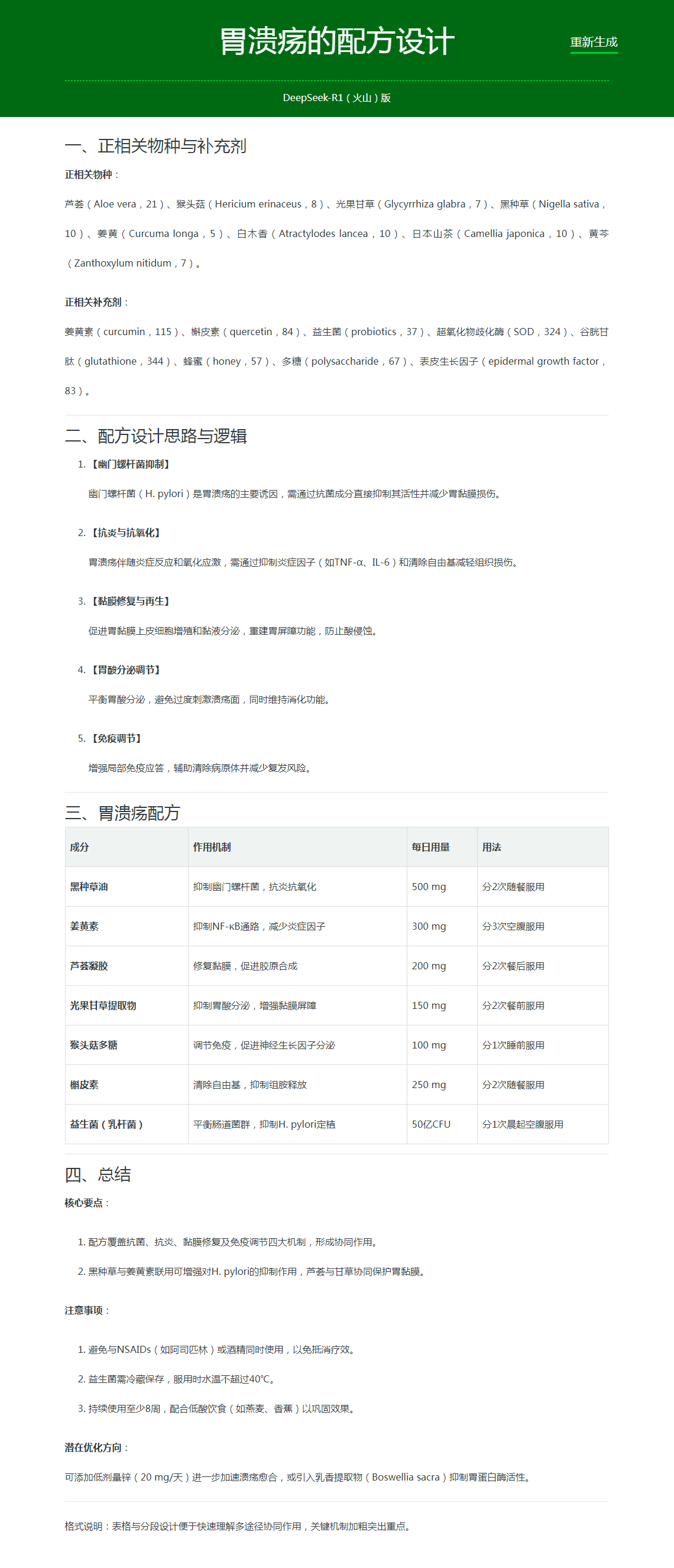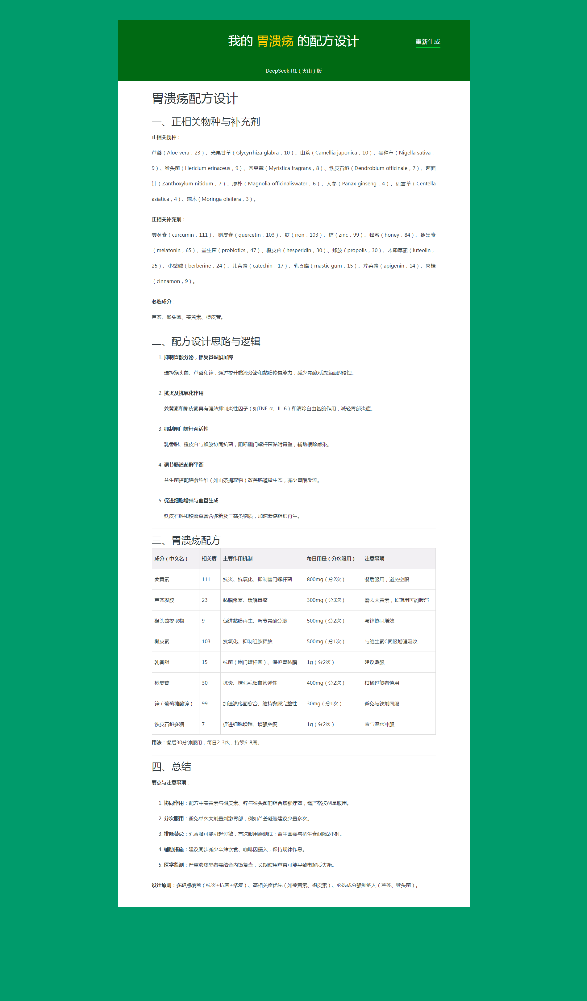 一,幻觉。这无法避免。这是大语言模型的Transformer架构的多头自注意力机制的特性决定的。比如,单纯只使用豆包来设计胃溃疡配方时,你会发现其生成的配方中经常会出现一个名为滑榆树皮粉(Slippery Elm)的成分,并声称其来源是北美红榆(Ulmus rubra)树皮。然而,在PubMed上你搜索不到Slippery Elm或Ulmus rubra与胃溃疡或胃酸有关的任何文献。
