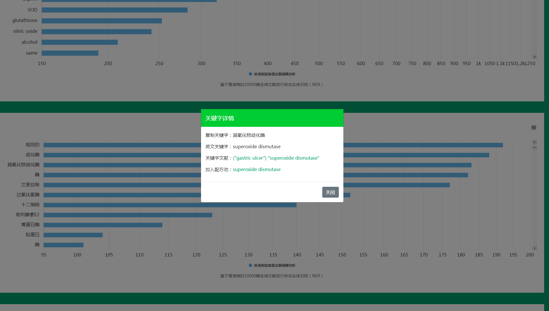 在大多数情况下,对于有一定营养学知识或医学知识的用户,可以很容易地区分哪些物种和补充剂是与该疾病或诉求正相关的,哪些物种和补充剂是与疾病或诉求负相关的。但对于缺乏营养学知识或医学知识的用户而言,区分二者会有些难度。当然,此时您可以通过在物种或补充剂的蓝条上点击,在弹出的关键字详情中点击关键字文献,以中英文双语快速扫一眼文献的标题即可知道该物种或补充剂与该疾病或诉求是正相关还是负相关。但对于缺乏营养学知识或医学知识的用户而言,如果您发现对于大多数物种或补充剂,您都需要查看一下文献的标题才能确定是正相关还是负相关的话,则这种方式难免会有些低效。