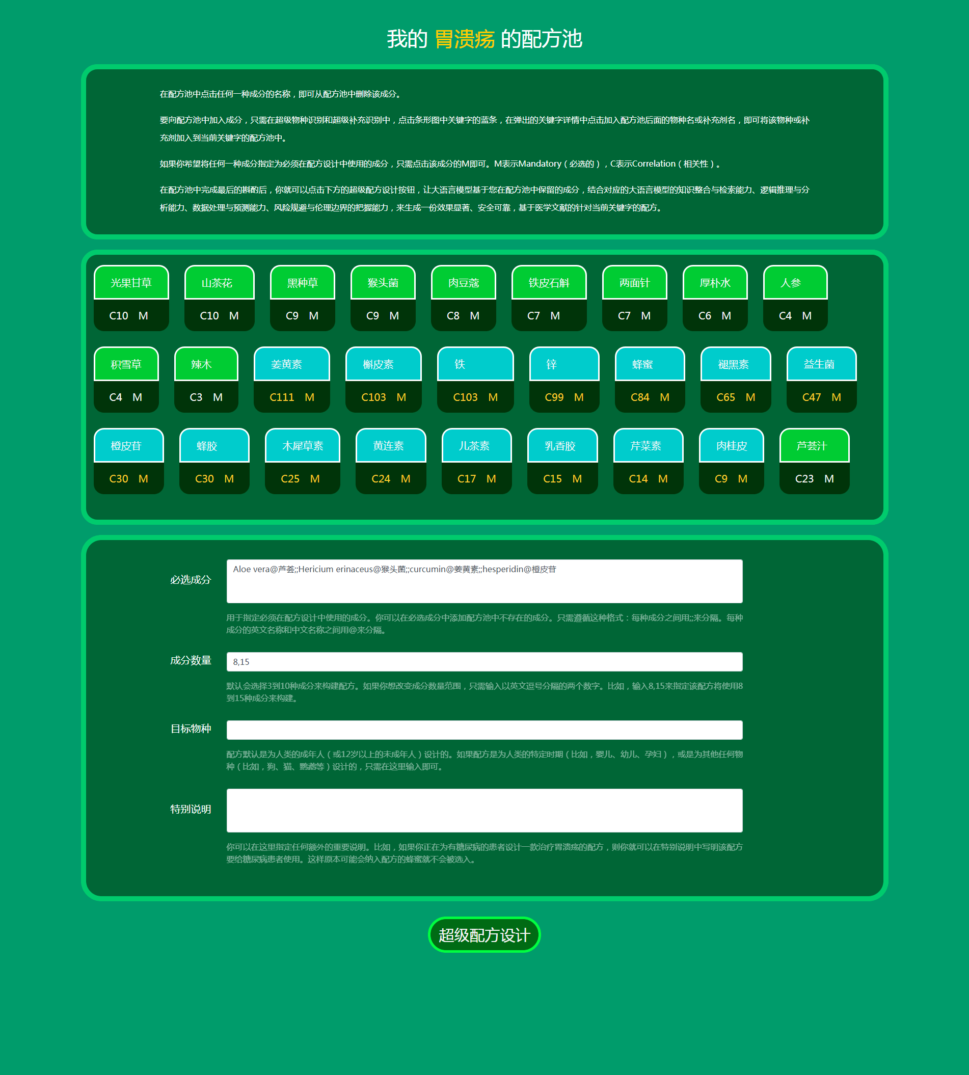 使用我的超级配方(自建配方池)时,您不仅可以指定哪些物种/补充剂被放入配方池,而且还可以通过设置必选成分、成分数量、目标物种、特别说明来完全控制最终生成的配方。