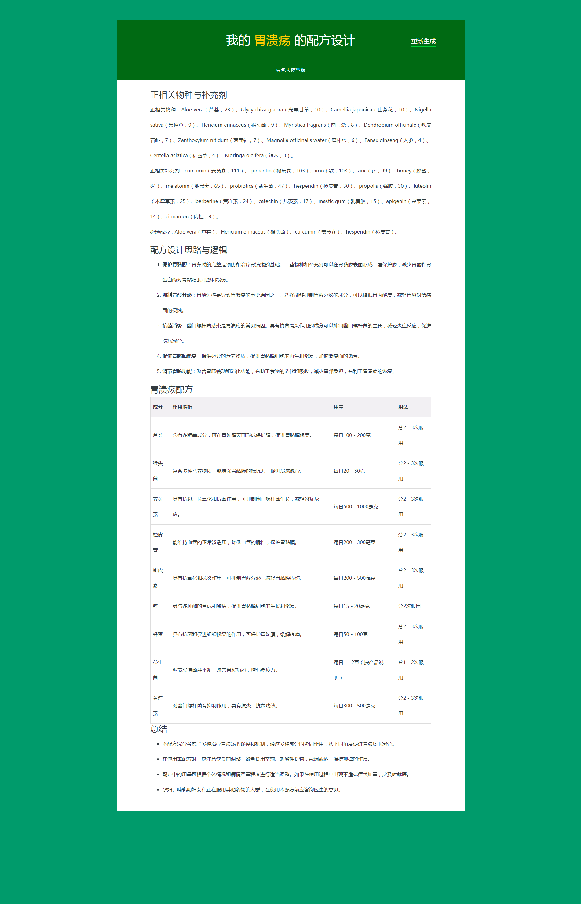 您可以在这里指定任何额外的重要说明。比如,如果您正在为有糖尿病的患者设计一款治疗胃溃疡的配方,则您就可以在特别说明中写明该配方要给糖尿病患者使用。这样原本可能会纳入配方的蜂蜜就不会被选入。