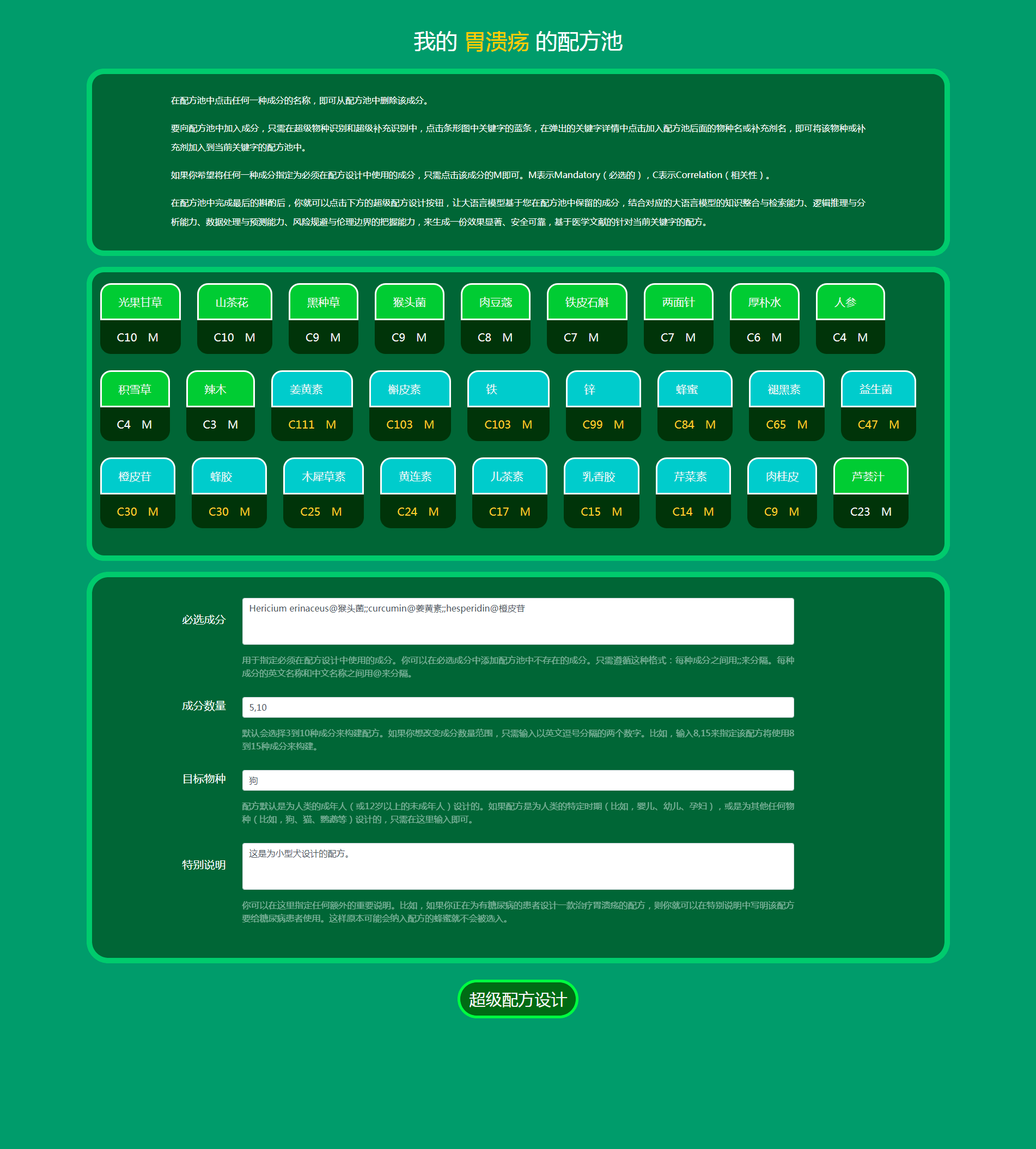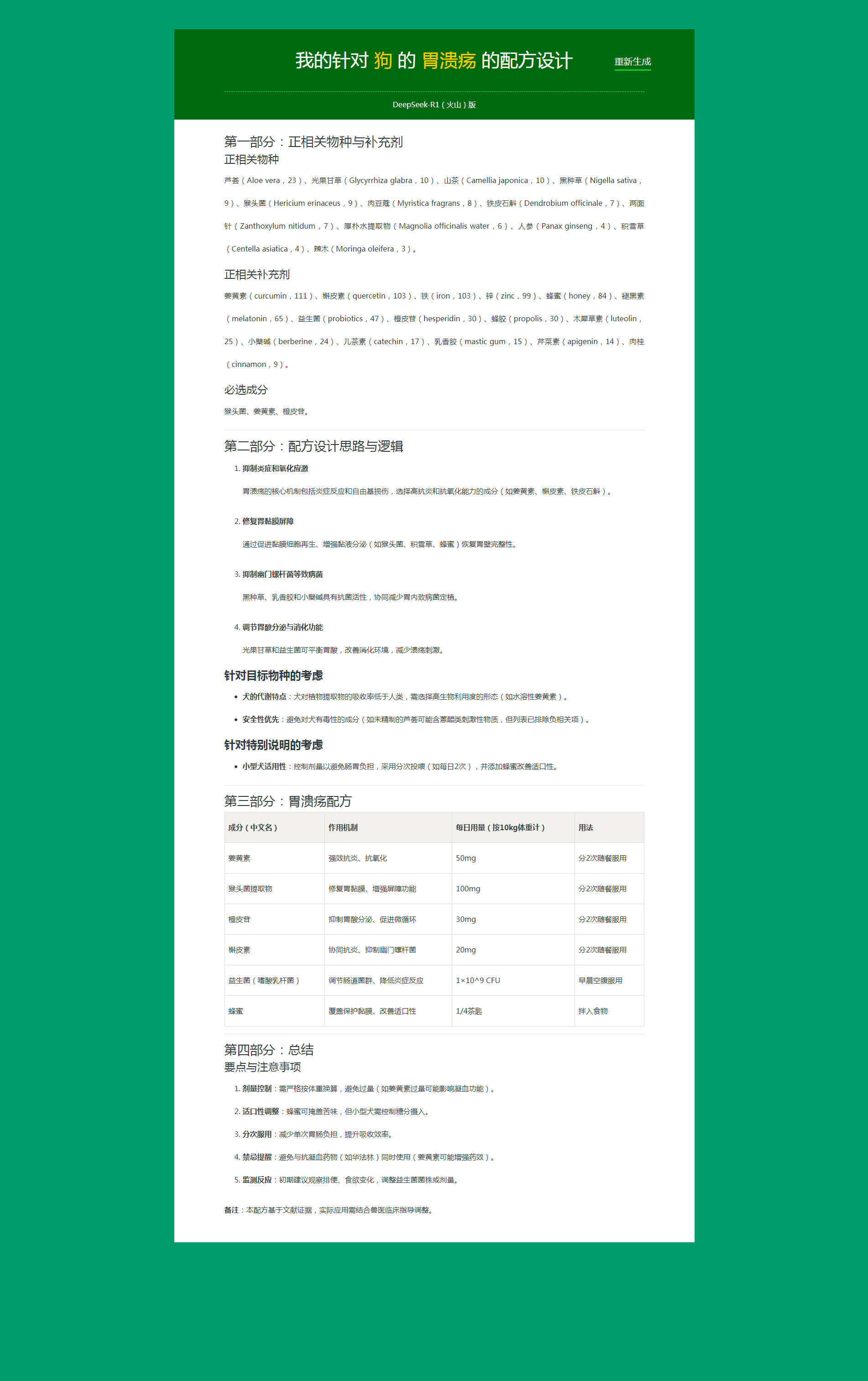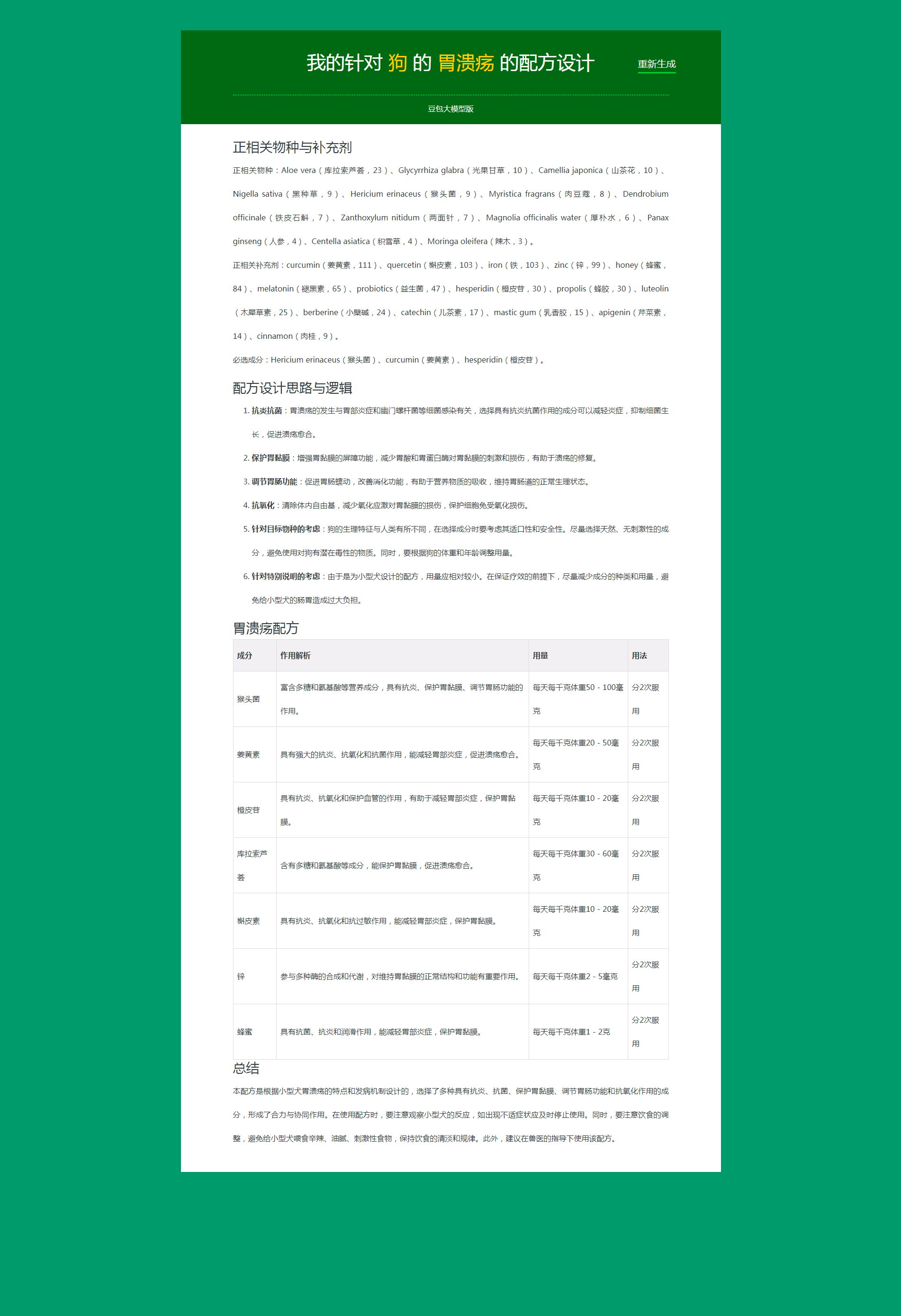 使用我的超级配方(自建配方池),给小型犬设计胃溃疡配方。