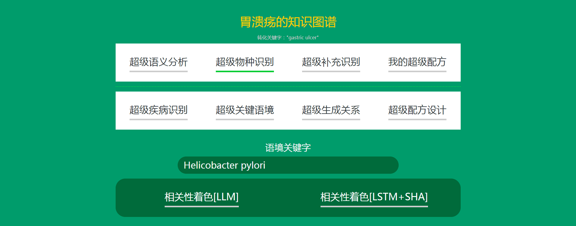 在使用大泽矩阵的超级数据中的超级物种识别和超级补充识别时,您只需点击相关性着色[LLM]或相关性着色[LSTM+SHA],即可对物种名实体和补充剂实体进行相关性着色。
